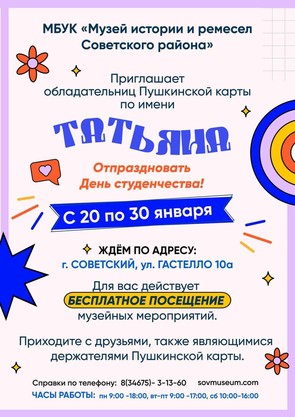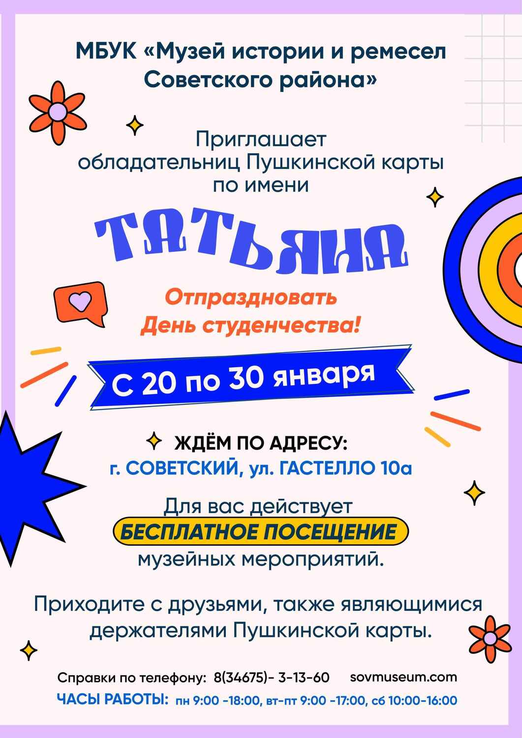 Тогда у нас для вас подарок! С 20 по 30 января приходите в Музей истории и ремесел Советского района. Собирайте друзей (по Пушкинской карте им тоже будет отлично), а для вас, Татьяны, в эти дни наши мероприятия - абсолютно бесплатно! Да-да, именно для вас. Татьянин день - это ваш праздник, и мы это знаем. Приходите за впечатлениями и отличным настроением. Друзей зовите, постом делитесь!