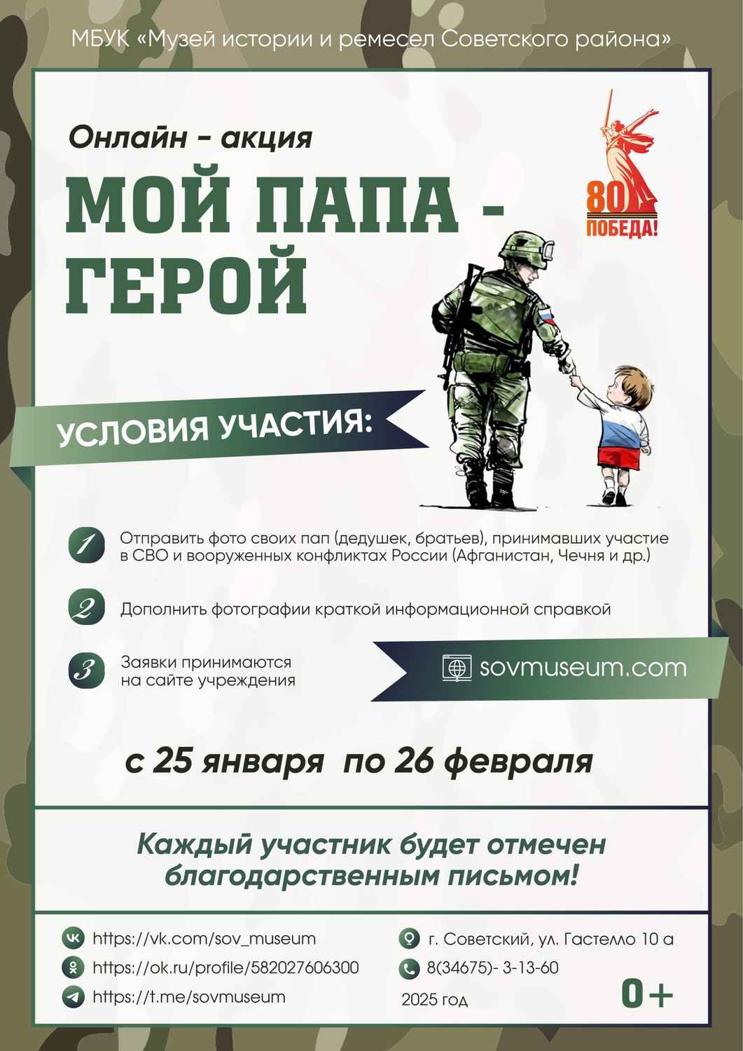 В рамках месячника по оборонно-массовой и спортивной работы и в целях пополнения музейного архива о воинах-интернационалистах и участниках СВО, Музей истории и ремесел Советского района запускает онлайн-акцию, чтобы отдать должное смелым и доблестным Защитникам нашей Родины. Поучаствовать в онлайн-акции могут семьи с детьми, чьи отцы (дедушки, братья) являются участниками СВО или ранее являлись участниками боевых действий, локальных военных конфликтов (Афганистан, Чечня и др.).