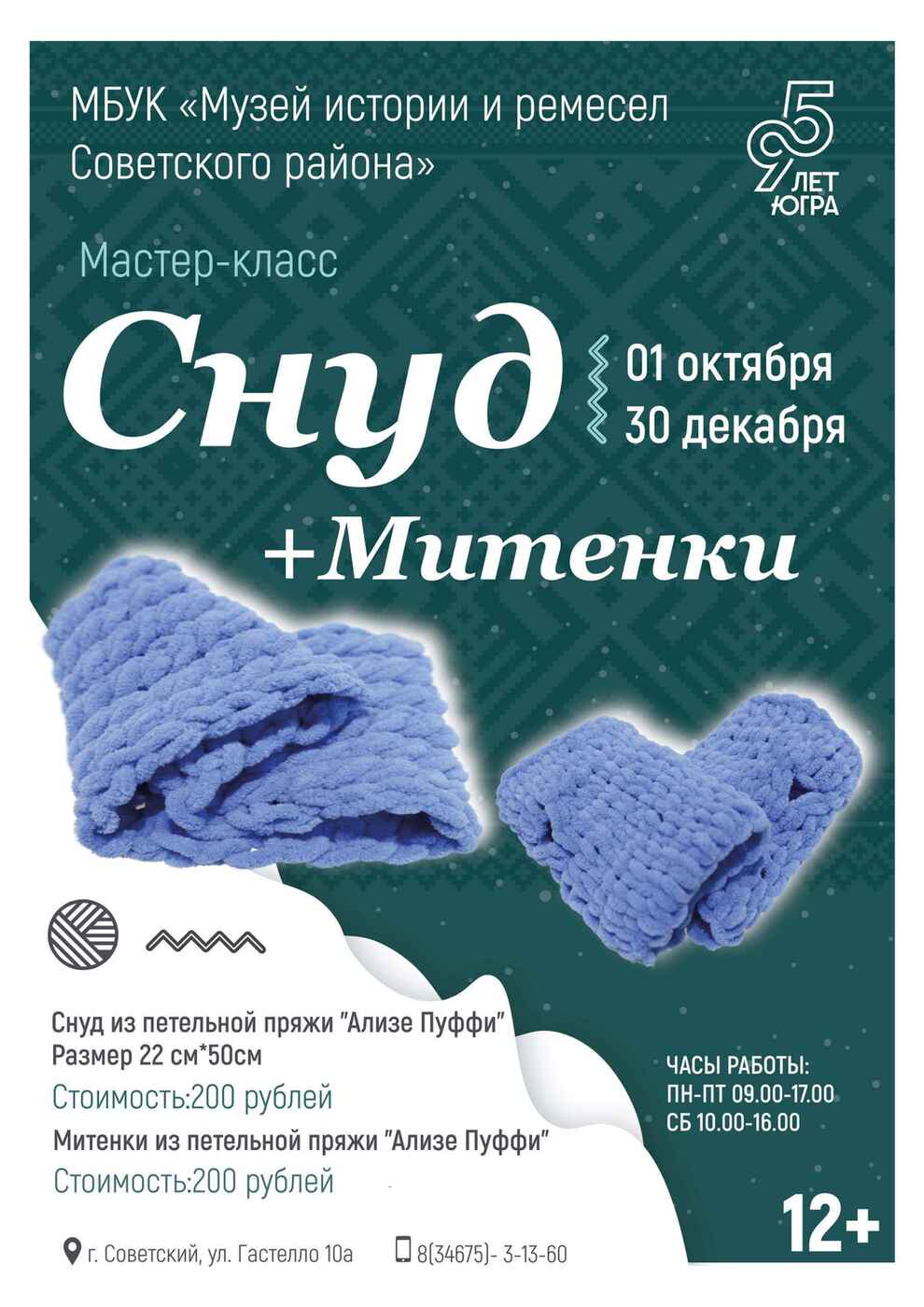 Наступают холода, а это значит, самое время утепляться! Музей истории и ремесел Советского района приглашает на мастер-класс по вязанию снуда и митенок из мягкой петельной пряжи «Ализе Пуффи». Участники мастер-класса будут вязать не спицами и не крючком, а пальцами. Это очень просто и быстро, поэтому мы ждём всех - и взрослых, и детей. Всего за несколько часов можно связать стильный объемный снуд и очаровательные митенки (перчатки без пальцев).
