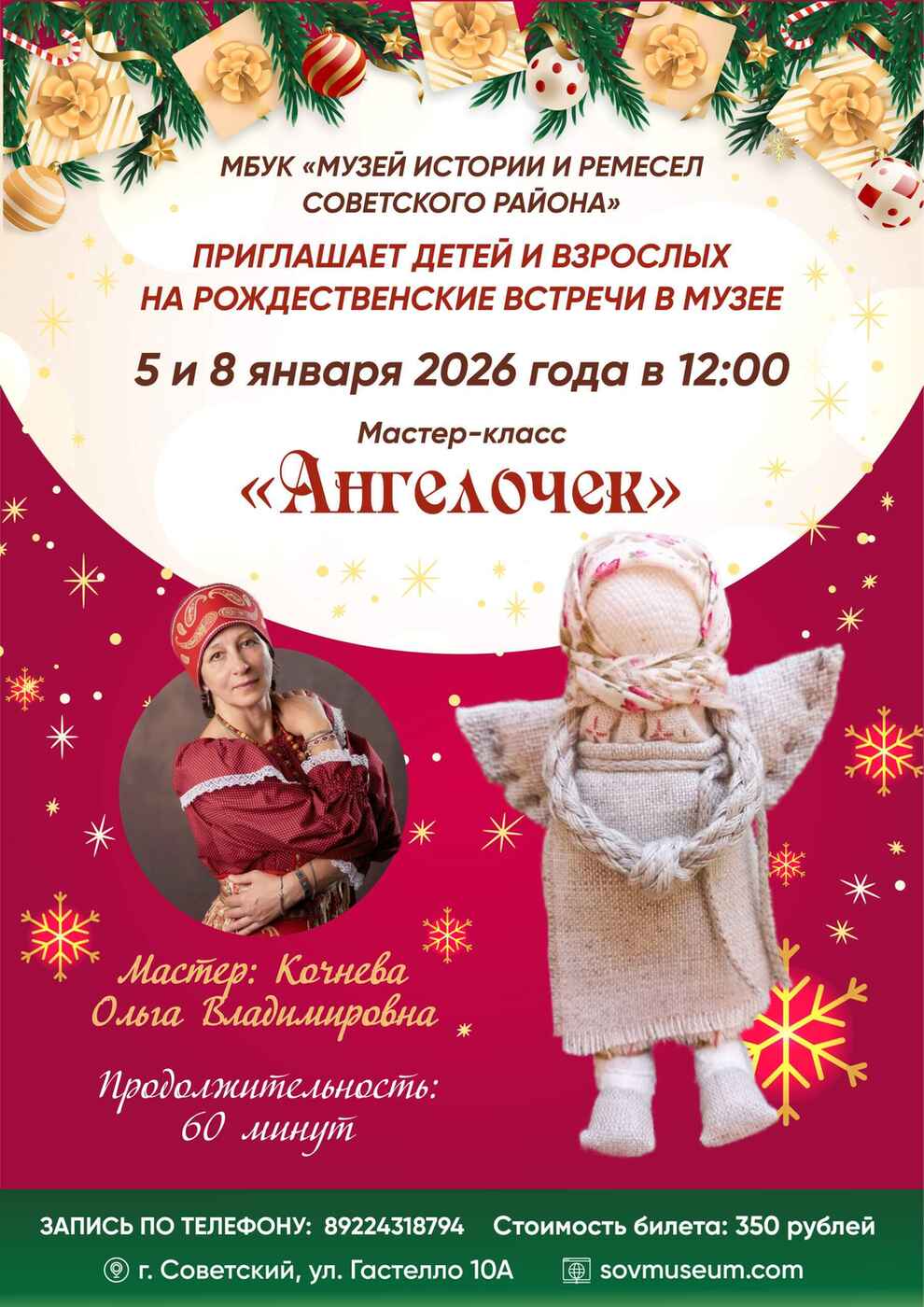 5 и 8 января 2026 года в 12:00 приглашаем детей и взрослых на рождественские встречи в Музей истории и ремесел Советского района. Вместе с мастером Кочневой Ольгой Владимировной вы создадите куклу «Ангелочек» своими руками! Это отличная возможность провести время в кругу семьи или друзей, а также унести домой милый рождественский сувенир, сделанный с любовью. Ольга Владимировна с радостью поделится секретами рукоделия и поможет каждому участнику воплотить свою идею.
