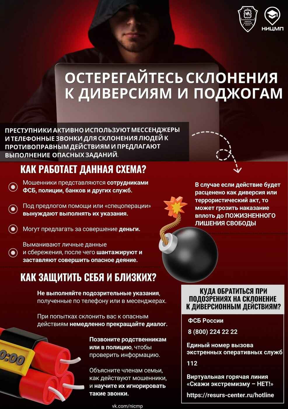 НИЦ Мониторинга и профилактики напоминает о способах склонения и ответственности за совершение диверсий. Злоумышленники по телефону представляются сотрудниками спецслужб или иных ведомств и могут склонять вас к совершению поджогов, подрывов и других противоправных действий, используя обещания финансовой выгоды или метод шантажа. Диверсия - это преступление, которое может привести к большому количеству пострадавших и погибших людей, нарушению работы на жизненно важных объектах.