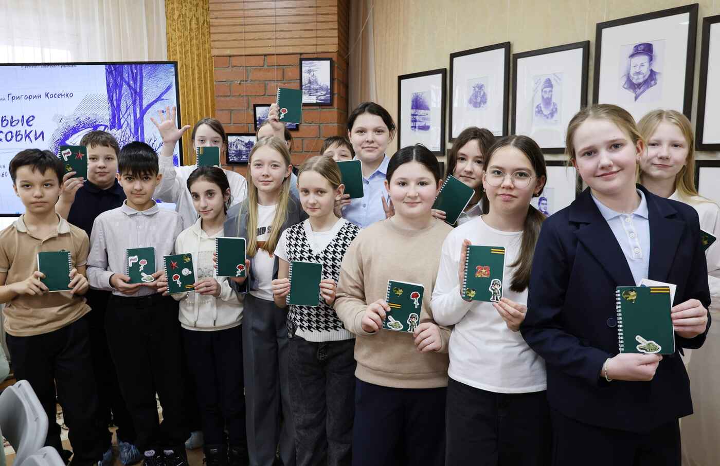 Им очень подробно рассказали о серии графических работ, выполненных простой шариковой ручкой на обычных тетрадных листах в клетку. Автором зарисовок является Косенко Григорий Владимирович, сотрудник Государственного музея Ханты-Мансийска, с 2022 года, находящийся в зоне СВО.