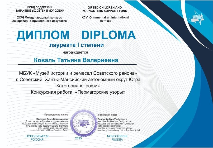По итогам XCVI Международного конкурса декоративно-прикладного искусства Фонда поддержки талантливых детей и молодежи методист Музея истории и ремесел Советского района Коваль Татьяна Валериевна стала лауреатом I степени в категории «Профи». Её конкурсная работа «Пермагорские узоры» была высоко оценена жюри и принесла ей заслуженную победу! От всей души поздравляем Татьяну Валериевну с этим достижением! Желаем неиссякаемого творческого вдохновения, ярких идей и новых побед! Мы вами гордимся!