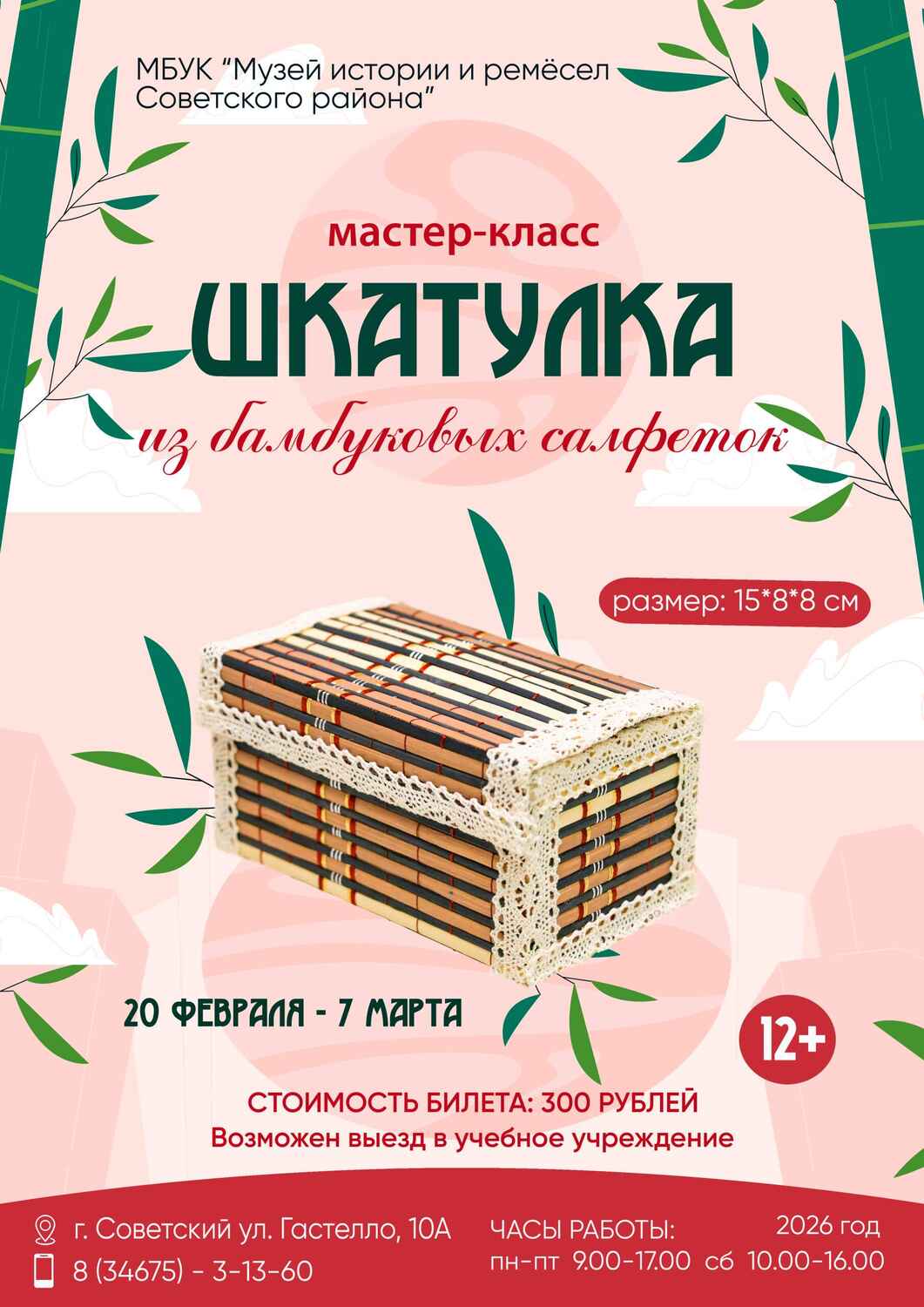 Приглашаем на творческий мастер-класс, где обычные бамбуковые салфетки превратятся в стильную и полезную вещь - изящную шкатулку. В ней можно хранить украшения, нитки для вышивания, памятные мелочи или просто поставить на полку как элемент декора. Размер шкатулки: 15*8*8 см Ждем всех с 20 февраля по 7 марта в Музее истории и ремесел Советского района Наш адрес: г. Советский, ул. Гастелло, 10А Стоимость: 300 рублей Телефон для справок и дополнительной информации: 3-13-60 | |