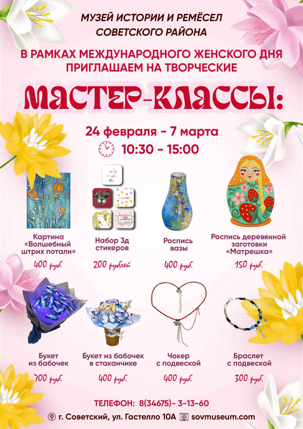 А значит, настало время подумать о том, как порадовать близких и любимых женщин: мам, бабушек, сестер, подруг и вторых половинок. Ведь это прекрасный повод окружить их теплом, заботой и сделать маленькие (или большие) приятные сюрпризы. А какие творческие мастер-классы вы можете посетить до 7 марта включительно в Музей истории и ремесел Советского района, смотрите в новости.
