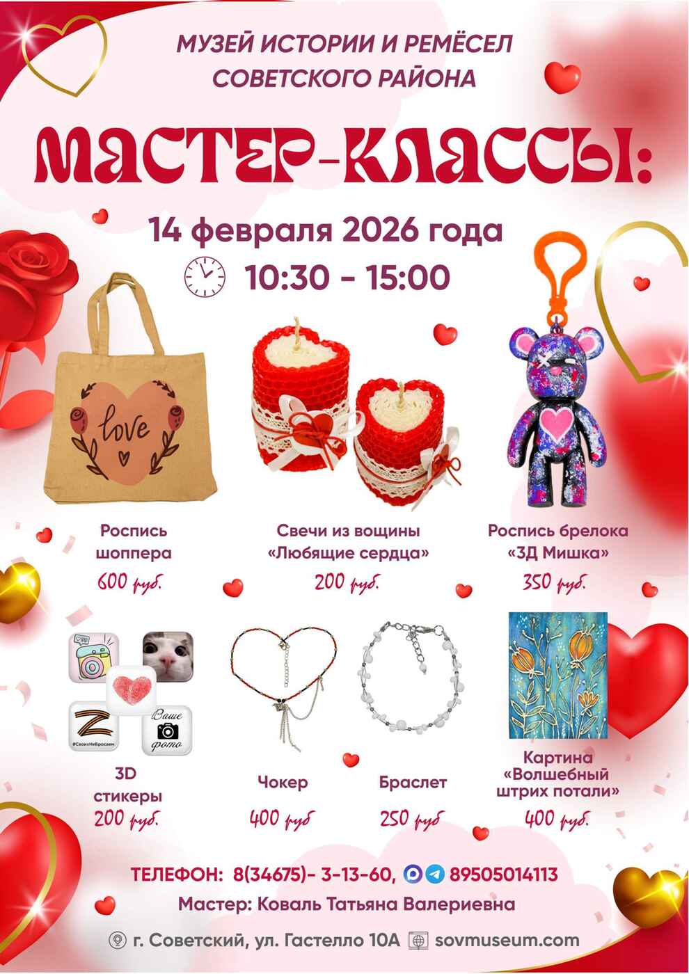 В воздухе витает романтическое настроение, навеянное ожиданием тепла и света, и в это время хочется дарить тепло и радовать себя и близких творческими подарками! Окунитесь в атмосферу творчества и романтики! Ждём всех желающих 14 февраля с 10:30 до 15:00 в Музее истории и ремесел Советского района.