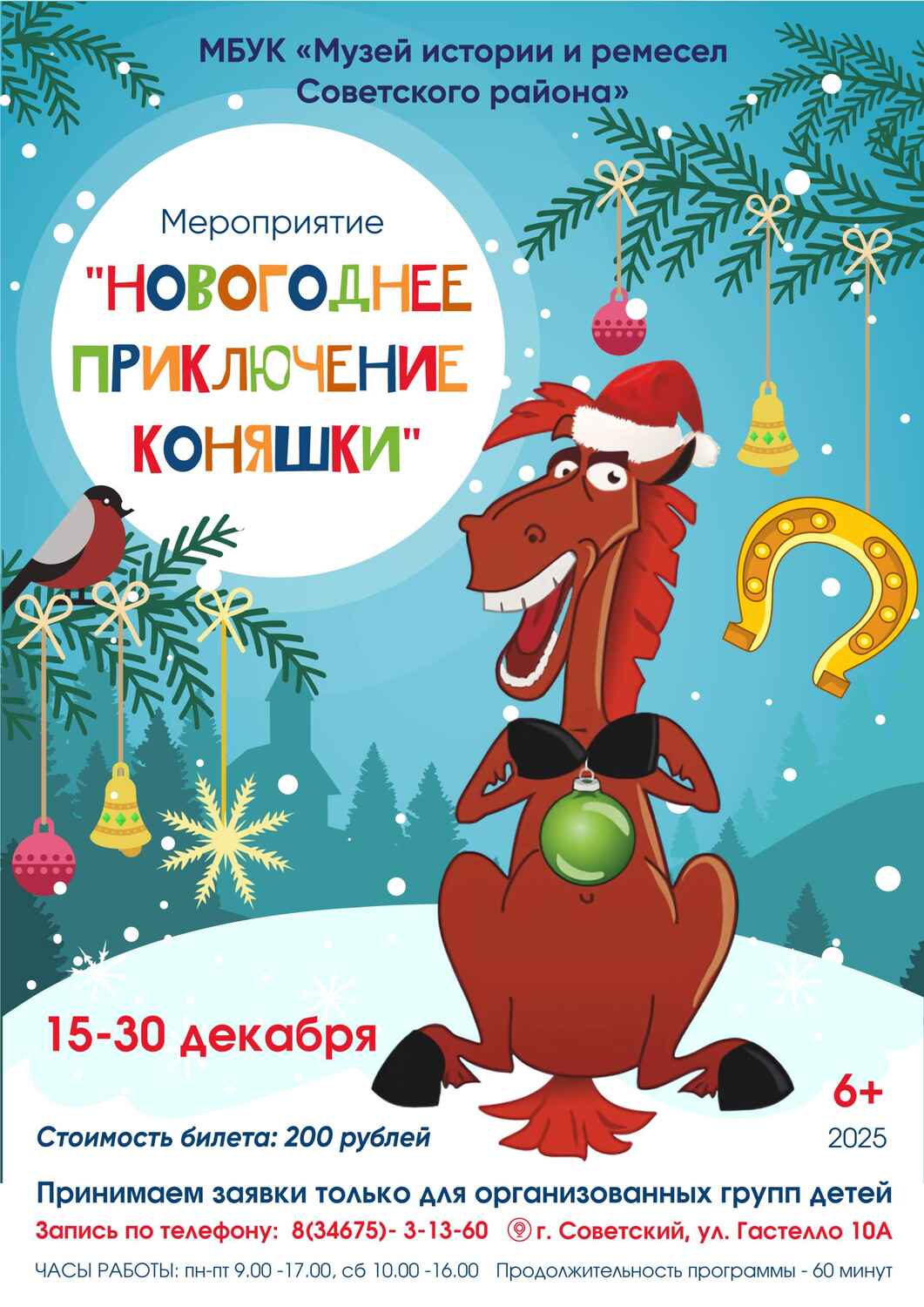 Из сказочной заснеженной дымки на нас несется он - новогодний КОНЯШКА! В его копытах обещание самого волшебного 2026 года. Но подождите! Это обещание удачи еще надо постараться найти в новогодней атмосфере музейных залов. С 15 декабря мы приглашаем организованные группы юных искателей приключений (6+) на предновогоднее мероприятие «Новогоднее приключение коняшки». Приходите, будет весело, интересно и по-музейному познавательно!