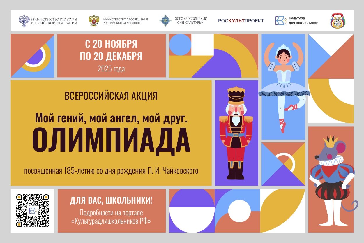 С 20 ноября по 20 декабря 2025 года в рамках межведомственного культурно-образовательного проекта «Культура для школьников» проходит всероссийская акция «Мой гений, мой ангел, мой друг. Олимпиада», посвященная 185-летию со дня рождения величайшего русского композитора П.И. Чайковского.
