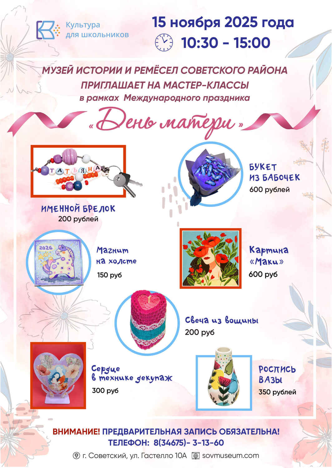 Ждём всех желающих 15 ноября с 10:30 до 15:00 в Музее истории и ремесел Советского района Внимание! Контактный телефон для записи: 3-13-60 Наш адрес: г. Советский, ул. Гастелло, 10А