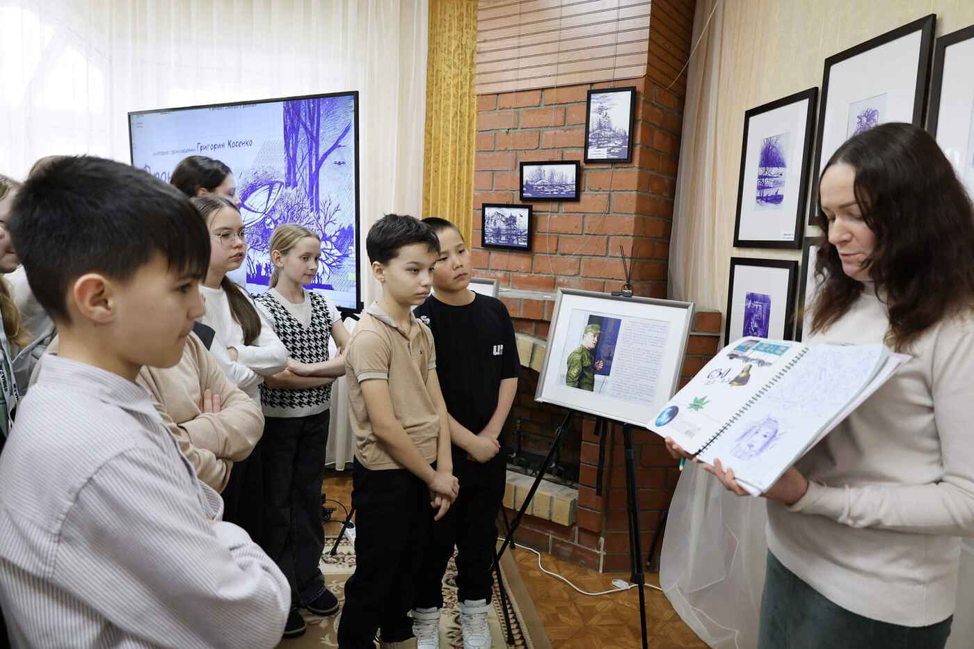 Им очень подробно рассказали о серии графических работ, выполненных простой шариковой ручкой на обычных тетрадных листах в клетку. Автором зарисовок является Косенко Григорий Владимирович, сотрудник Государственного музея Ханты-Мансийска, с 2022 года, находящийся в зоне СВО.