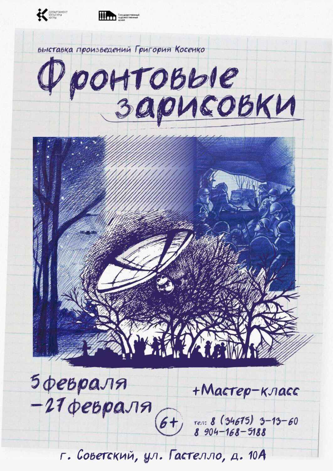 Друзья! С 5 по 27 февраля приглашаем вас на мероприятие «Фронтовые зарисовки». Вас ждёт экскурсия по одноимённой выставке из фондов Государственного художественного музея Ханты-Мансийска, а затем творческий мастер-класс. Эта выставка - живой дневник, созданный в самом центре событий. Автор графических работ - Григорий Косенко, сотрудник Государственного художественного музея Ханты-Мансийска, мобилизованный в зону СВО в 2022 году и сегодня продолжающий свою службу.